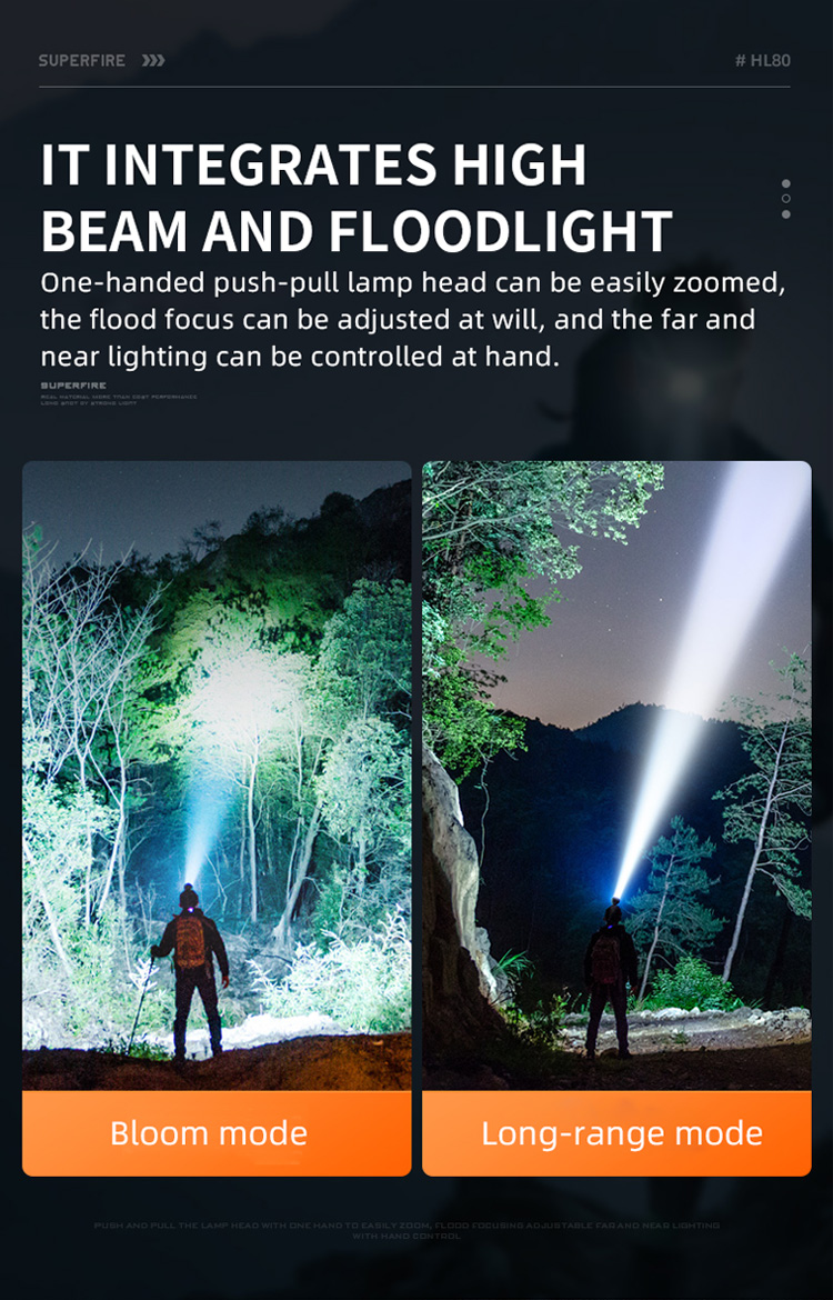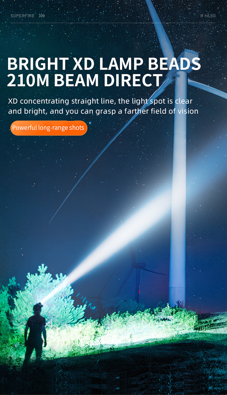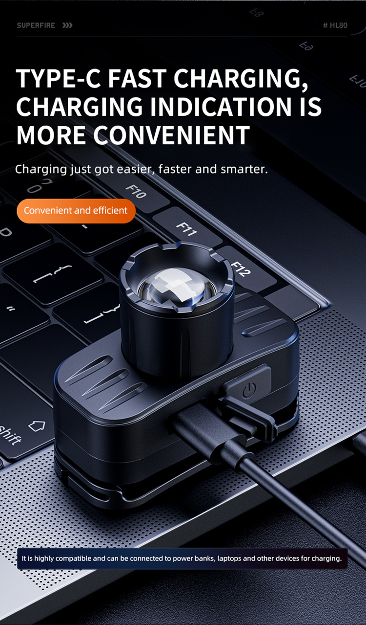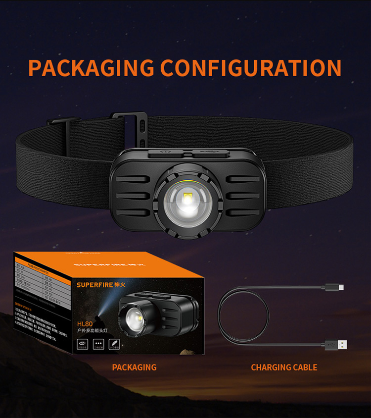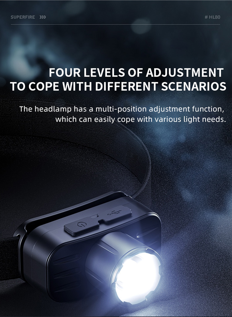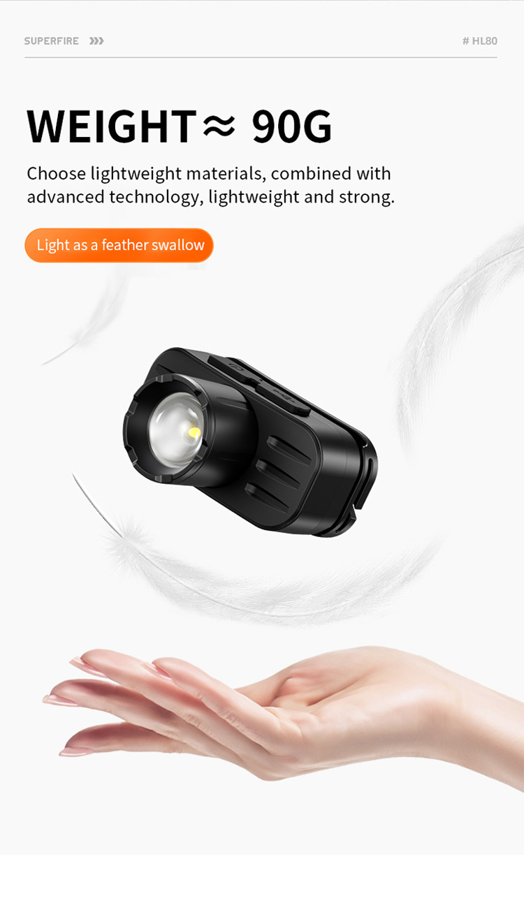 SUPERFIRE HL80 헤드 램프는 다양성과 편의성을 위해 설계되었습니다. 130 루멘의 최대 출력을 특징으로합니다. 일반적으로 여러 밝기 설정과 편안하고 조정 가능한 헤드 밴드가 포함됩니다. 무게 90g 만, 경량 소재를 선택하십시오. 첨단 기술, 가볍고 강한. 충전을 위해 편리한 type-c 인터페이스를 채택하십시오. 다른 시나리오 캠핑, 하이킹, 저조도 환경에서 일하는 등 다양한 활동에 적합합니다.